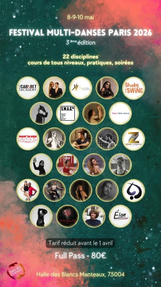 Unique en France, le Festival Multi-Danses Paris réunit une diversité de styles inégalée en un seul lieu : bachata, salsa, tango argentin, danse contemporaine, lindy hop, waacking, zouk brésilien, danse classique et bien d'autres encore. Chaque édition renouvelle sa programmation pour vous faire découvrir des danses, des écoles et des approches que vous n'auriez jamais croisées ailleurs aussi facilement.